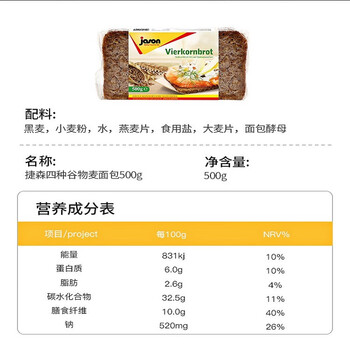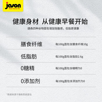 • 捷森jason 四种谷物面包500g/袋 饼干蛋糕 营养早餐吐司 粗粮无蔗糖食品 健身代餐