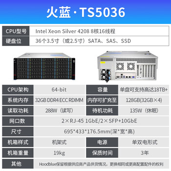 - 火蓝存储(hoodblue) TS5036万兆光纤nas存储服务器36盘4U机架磁盘阵列共享存储备份 TS5036-RP-648TB