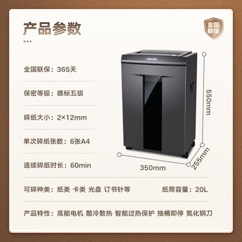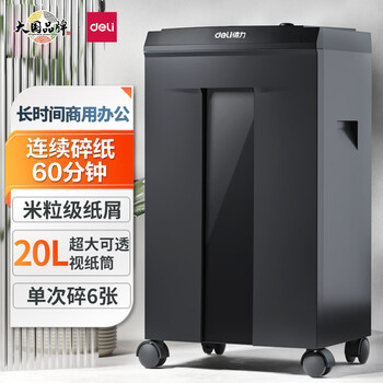 • 得力(deli)5级保密商用办公碎纸机 长时间碎纸机(单次6张 20L 持续60分钟 可碎卡)33467