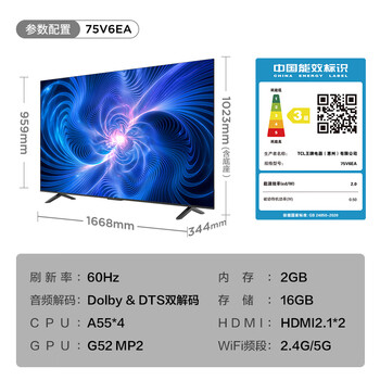 • TCL电视 75V6EA 75英寸 4K超清超薄金属全面屏 平板电视
