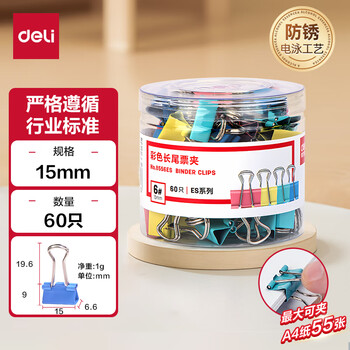 • 得力(deli)60只15mm彩色长尾夹票夹 6#小号金属燕尾夹票据文件夹子 办公用品 60只/筒 8556ES